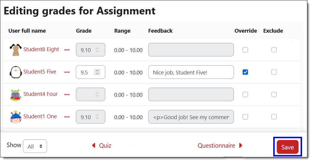 As you know, when you add a graded assignment or quiz to your course main page, a corresponding item is automatically created in the gradebook. Moodle expects you to enter grades directly through the activity link on the main course page, not from the gradebook. As a result, the score and feedback fields for these items in Single view will be shaded out (as in the example above), and you won't be able to enter scores directly in those boxes. To enter scores for one of these items, check the box in the Override column for a given student or click on Override all in the Actions menu to allow you to enter scores for every student. Be sure to click on Save to record any changes you make.