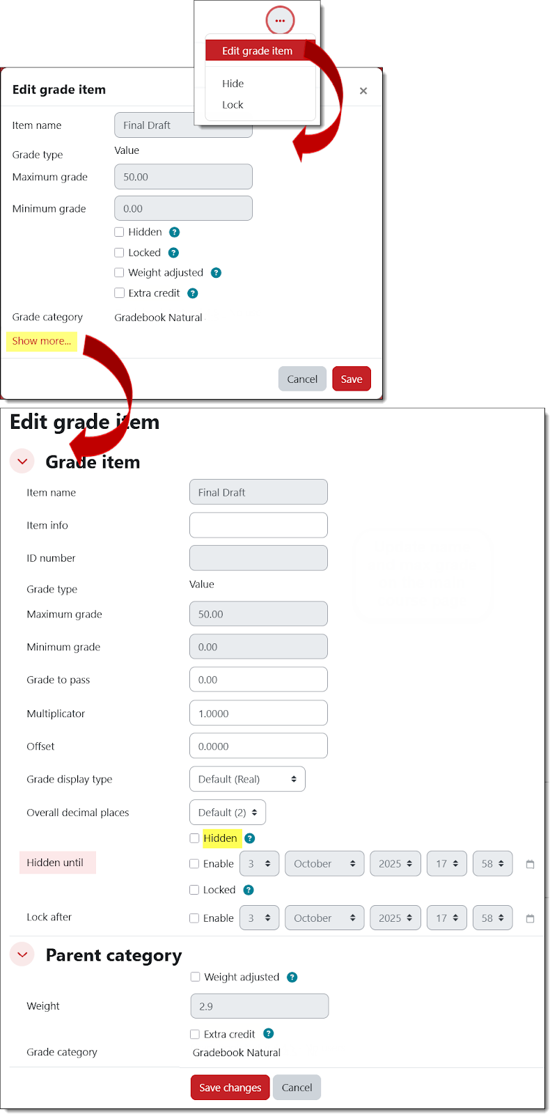 - Scroll down and choose Hidden to hide the grade item indefinitely or enable the Hidden until option and set the date and time that you want the scores to become available to students.