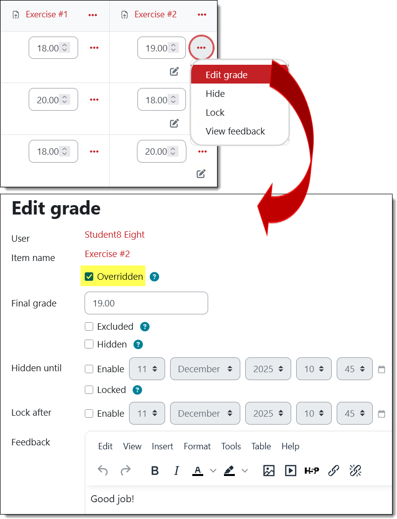 Some activities are designed to be scored automatically (like quizzes and questionnaires) while others enable you to enter scores via the activity itself (such as assignments and forums). When scores are entered for these items directly in the gradebook instead, the grades are “overridden.”