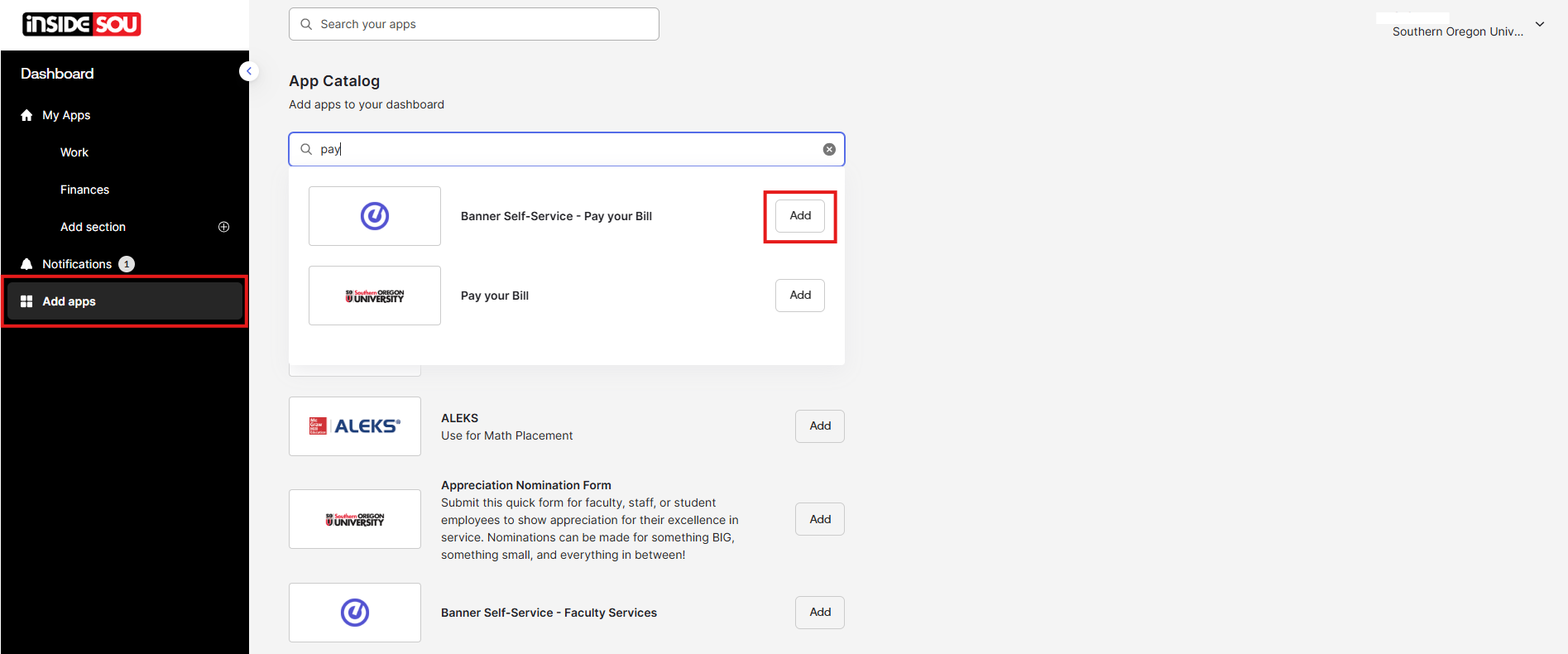 If you are unable to locate this app on your Okta Dashboard, then you will have to add the app. This can be done by clicking the Add apps link on the left-hand menu of your Okta Dashboard, then by searching the app catalogue for Banner Self-Service - Pay your Bill. Click the Add button next to the app.
