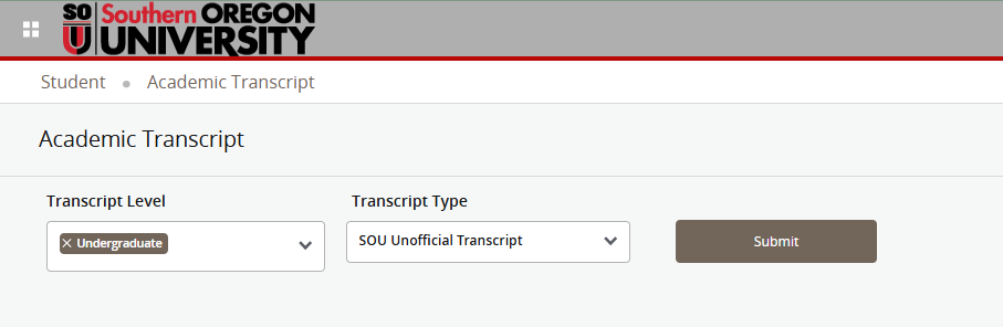 On the new windows, select the transcript level (i.e. graduate, undergraduate, etc.) and transcript type (SOU Unofficial Transcript)